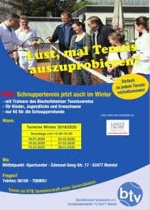 Im Winter bieten wir Schnuppertennis Sonntags von 14:00-16:00, jeweils im Mittelpunkt Sport Zentrum in Maintal-Dörnigheim an folgenden Sonntagen an: 19.01.2020, 02.02.2020, 16.02.2020,01.03.2020, 15.03.2020, 29.03.2020